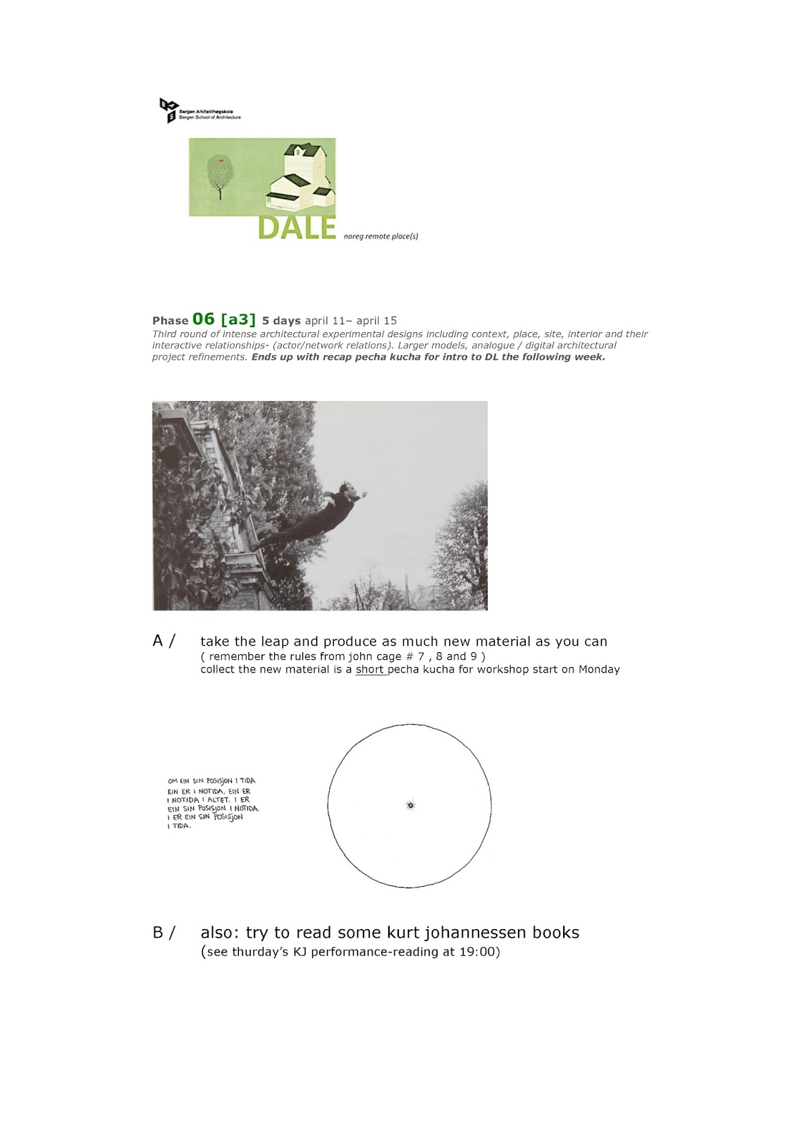 After the intense workshop with Daniel Liss (that hopefuly re-framed or re-focused some of your intentions /themes for your Dale projects) the next period shall be about the manufacture (making) of your architectural project(s) for Dale ... Make space(s) for something other than asphalt or more balconies /terrasses/ than is the case now. Be bold and compassionate to offer your qualifications to the manufacture of more poetic and livable alternative(s).